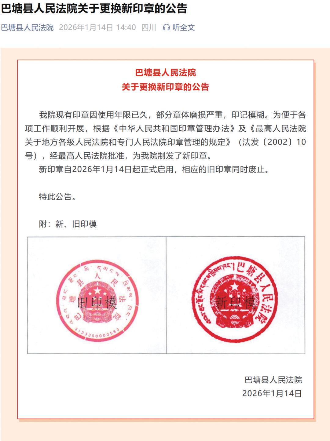 2026年1月,巴塘县人民法院发布更换新印章的公告。三个月后,法院被提醒,公告“援引了错误的法律法规”。巴塘县人民法院公众号截图